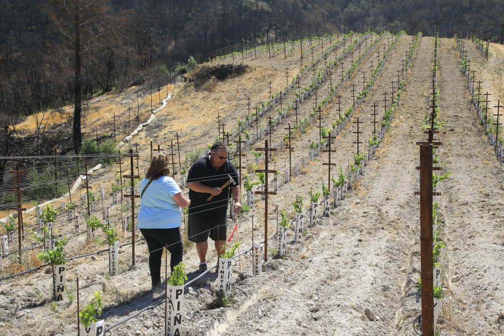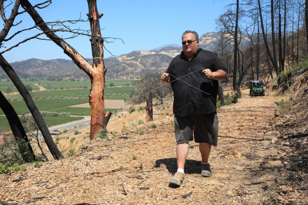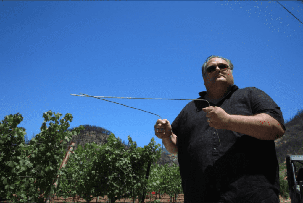 CALISTOGA — In a vineyard flanked by scorched hills and charcoal trees, Rob Thompson gripped two stainless steel rods, began rotating in a circle, and counted under his breath.